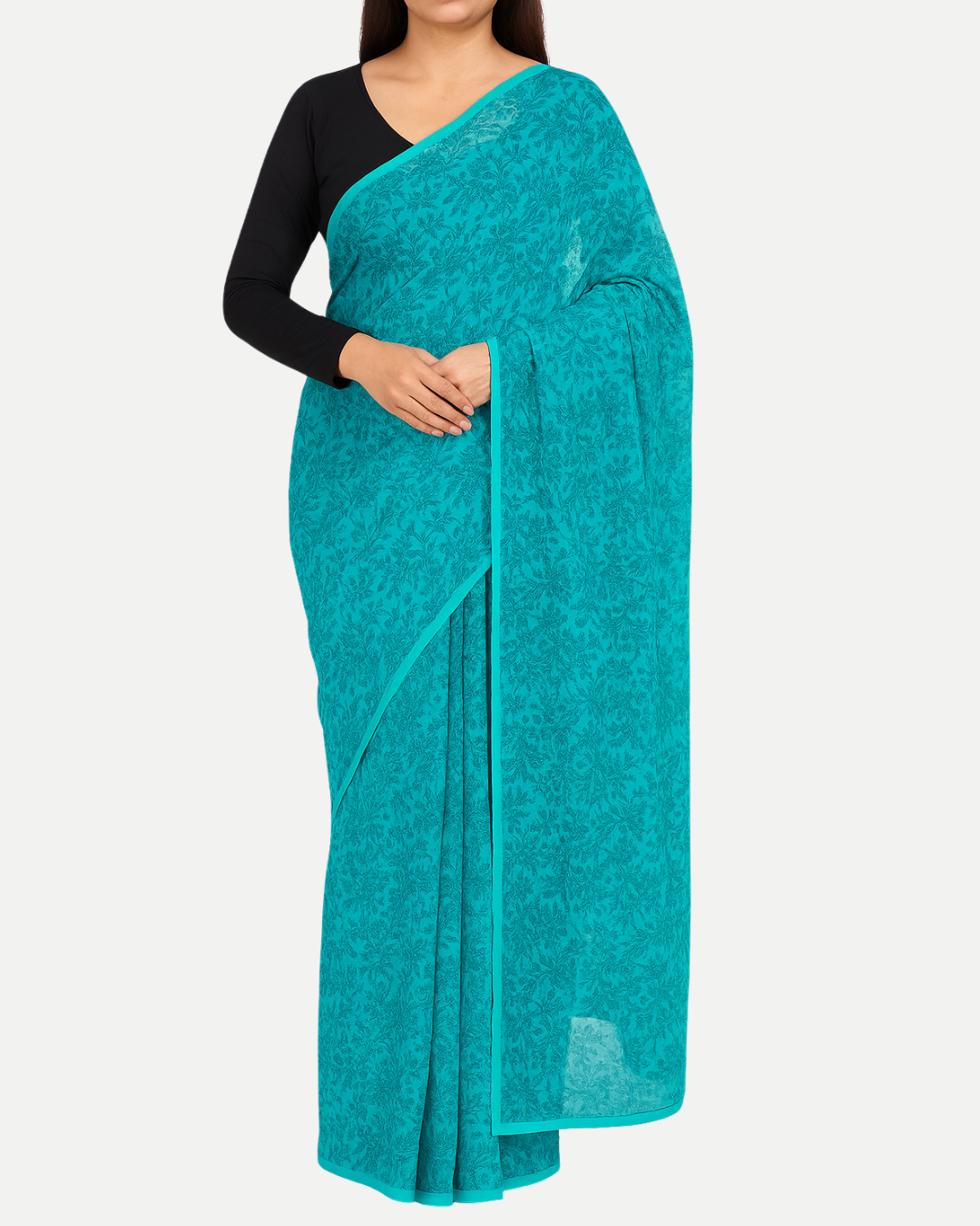 This vibrant turquoise saree, crafted from soft chiffon, showcases delicate leafy motifs spread across its sheer fabric, lending it a refreshing and elegant appeal. Its breezy texture and graceful fall make it an ideal pick for summer gatherings, festive brunches, or light celebrations where comfort meets effortless style.