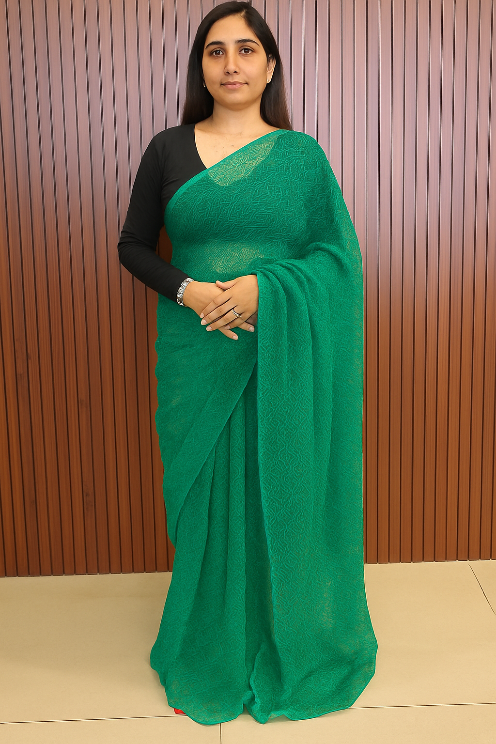 Grace meets geometry in our Emerald Echo saree — a rich green drape featuring a captivating all-over geometric pattern. Crafted from soft, breathable fabric, this saree exudes understated elegance with a modern touch. Perfect for office wear, formal gatherings, or casual evening outings, it brings together comfort and style in one timeless piece. Add minimal jewelry and let the design speak for itself