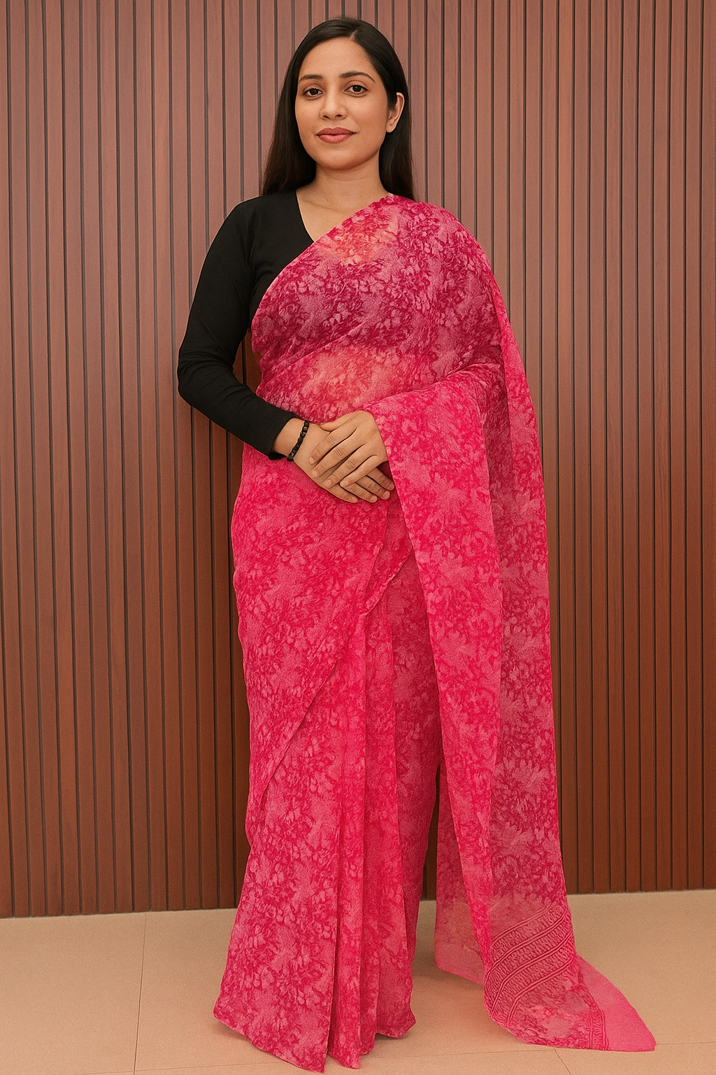 This vibrant chiffon saree showcases a lively floral pattern in rich shades of pink, blending timeless grace with a youthful flair. Light as air and effortlessly draping, the fabric moves with ease, making it ideal for festive gatherings, casual occasions, or warm-weather celebrations. Accented with a subtle sheen, this saree is a beautiful mix of comfort, color, and feminine charm—bringing a fresh twist to everyday elegance.